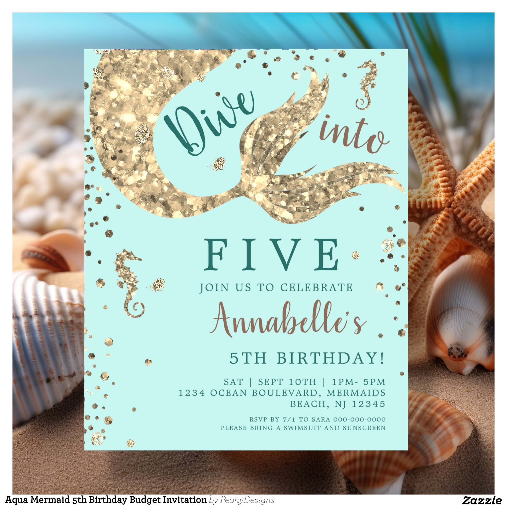 Aqua Mermaid 5th Birthday Budget Invitation