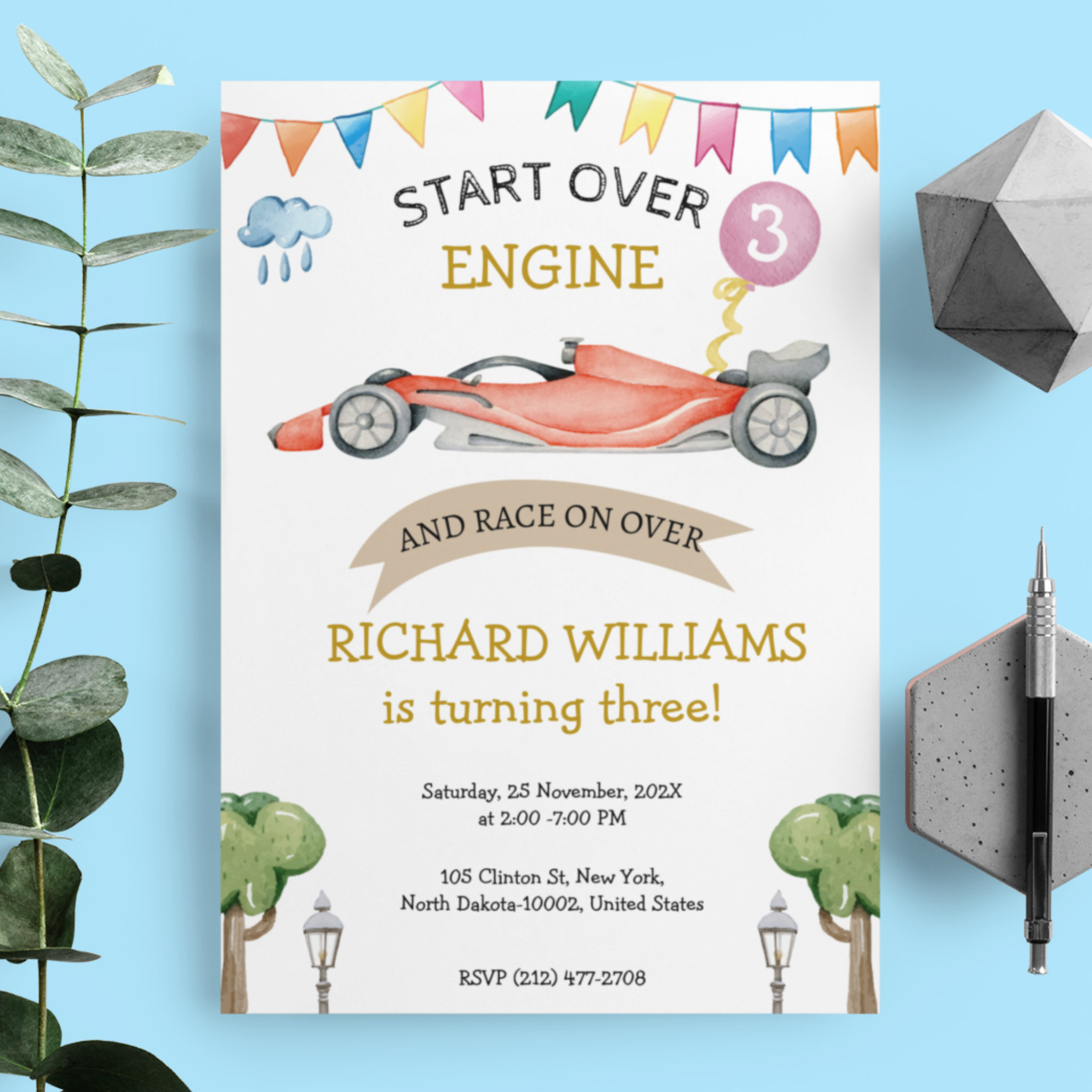Cute Racing Car Kid’s Birthday Theme Invitation