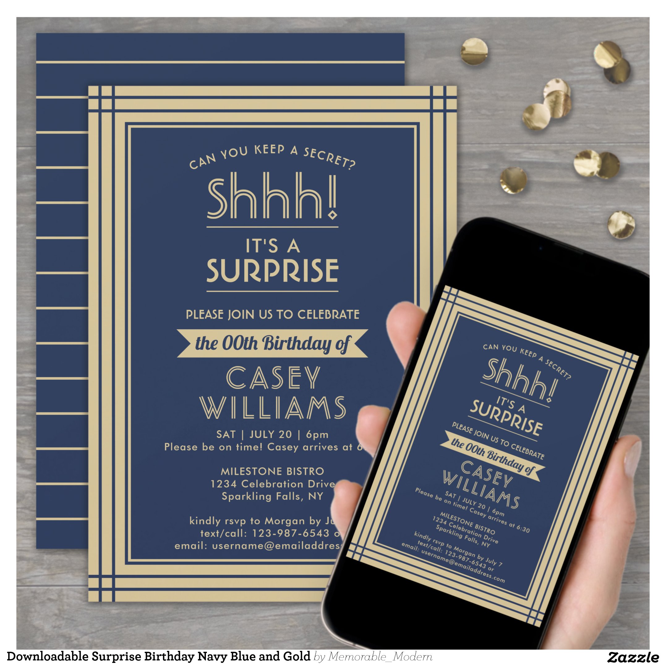 Downloadable Surprise Birthday Navy Blue and Gold Invitation