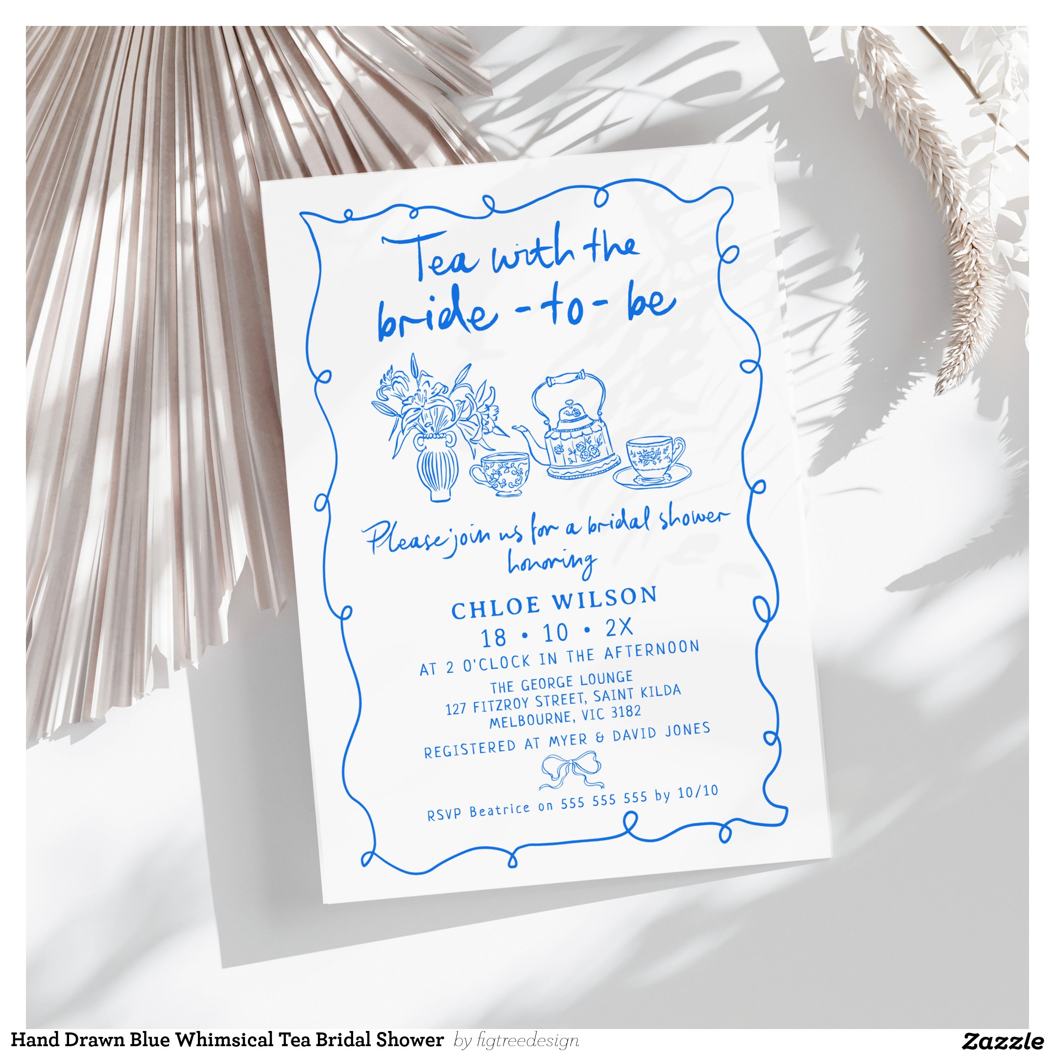 Hand Drawn Blue Whimsical Tea Bridal Shower Invitation