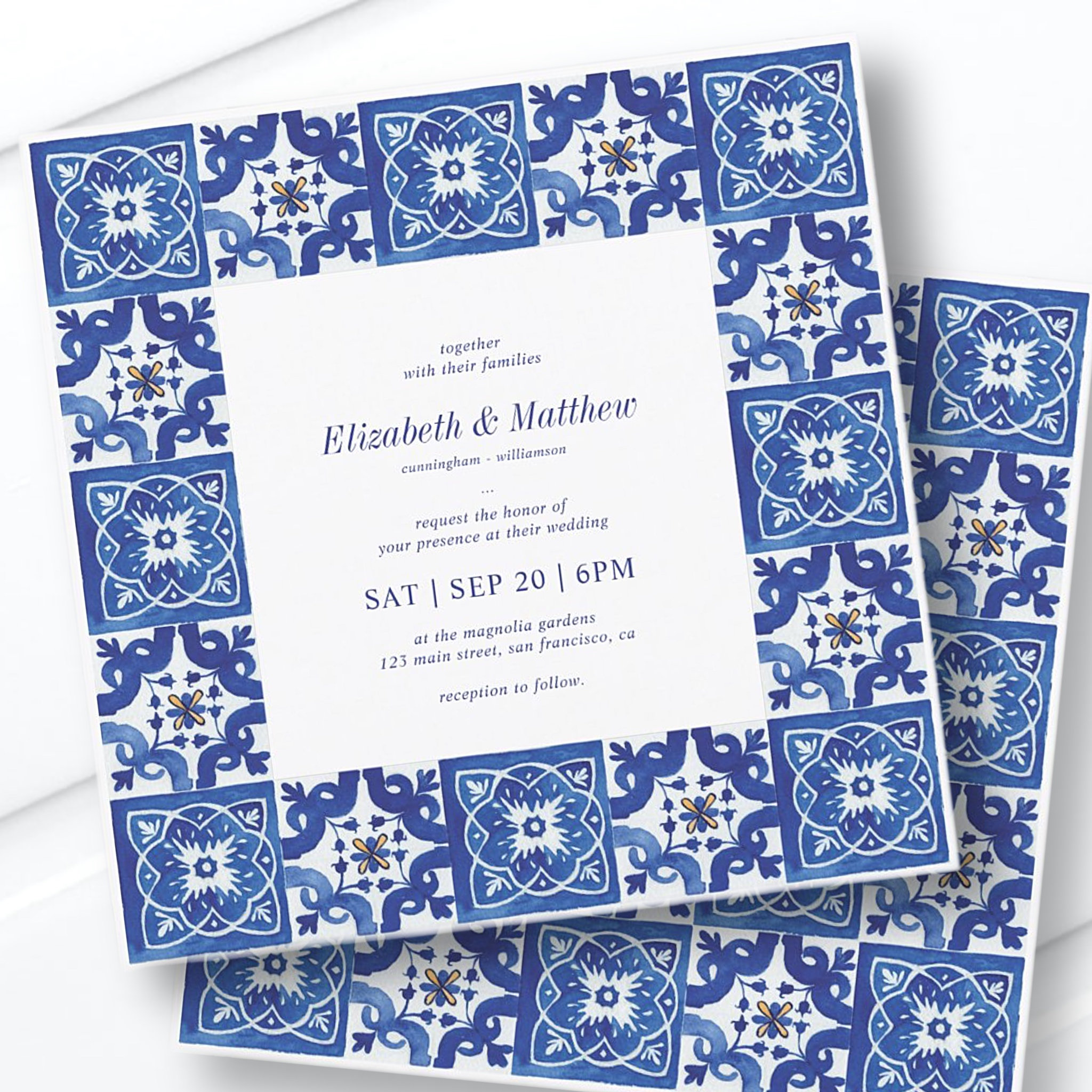 Modern Blue & White Mediterranean Tiles Wedding Invitation