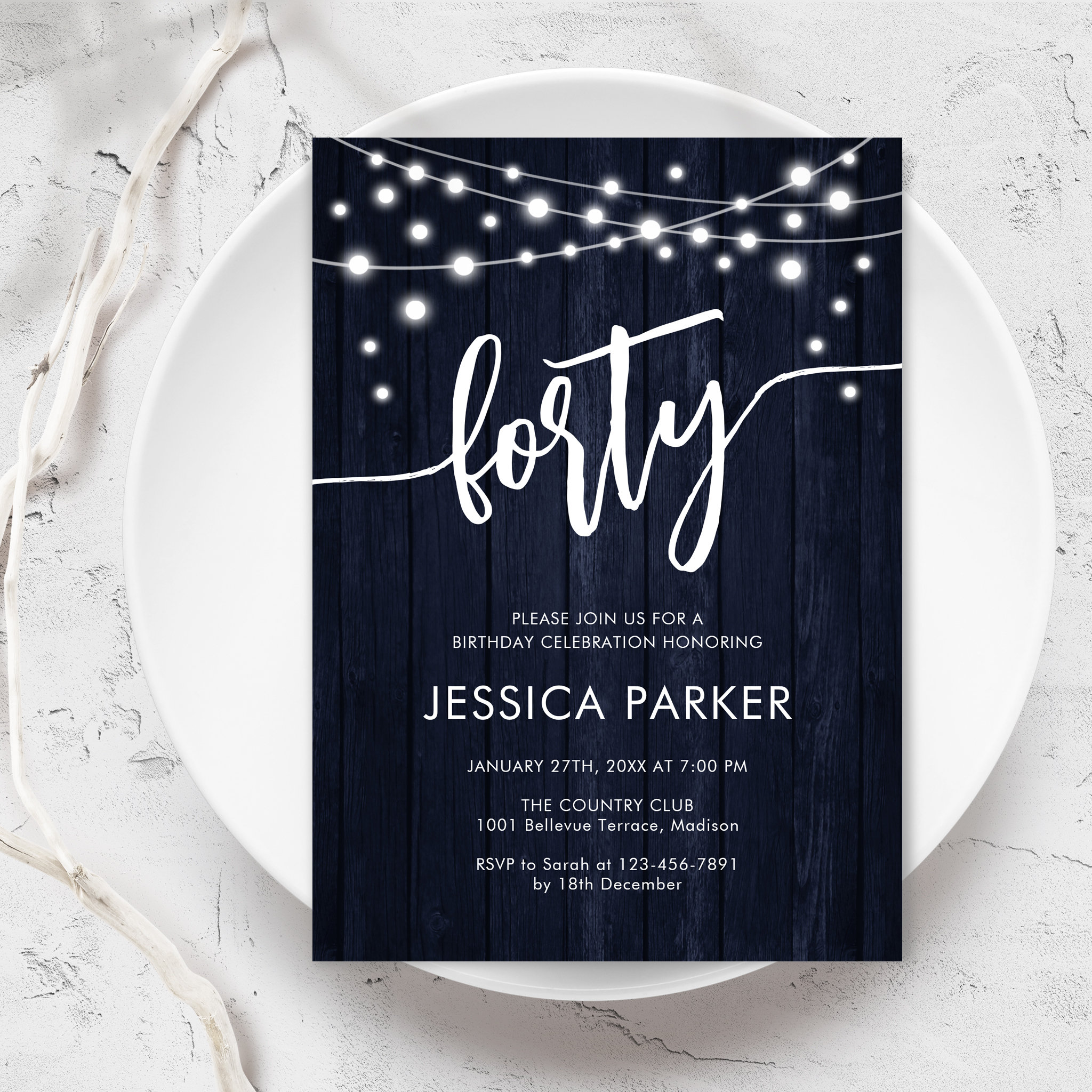 Navy White Rustic Wood 40th Birthday Party Invitation
