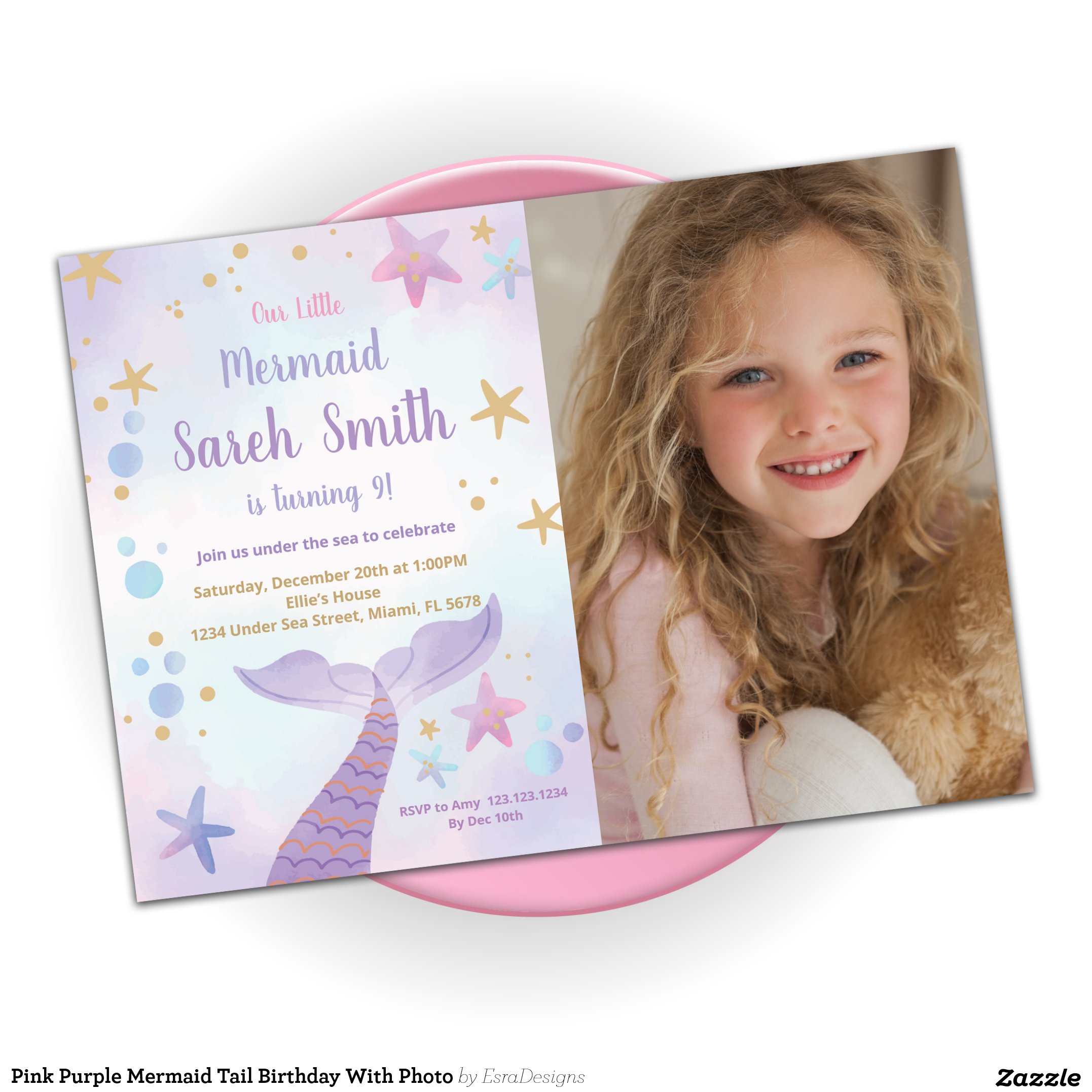 Pink Purple Mermaid Tail Birthday With Photo Invitation