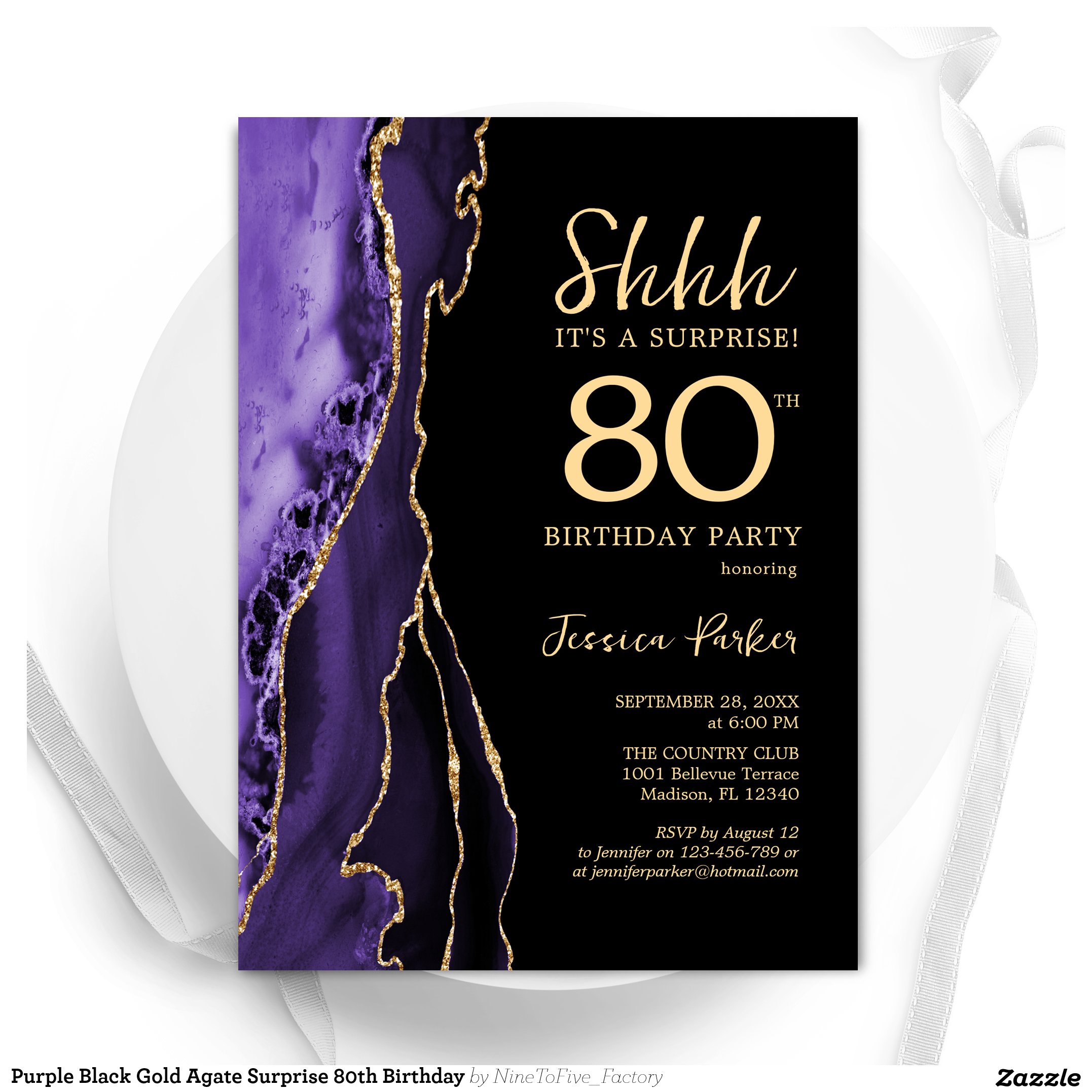 Purple Black Gold Agate Surprise 80th Birthday Invitation
