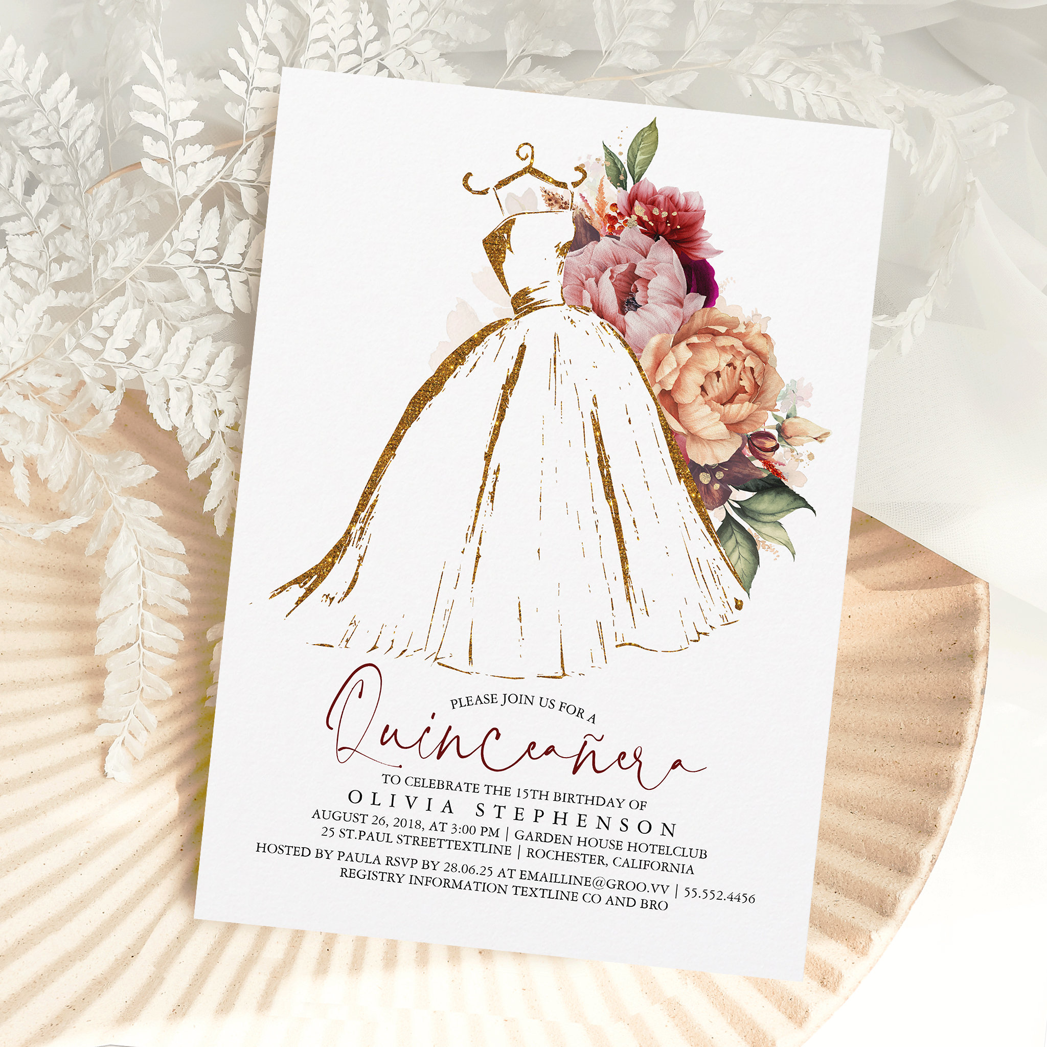 Quincea?era Floral Gold Dress 15th Birthday Invitation