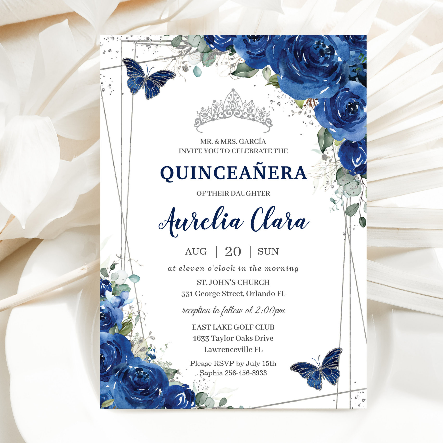 Quincea?era Royal Blue Floral Butterflies Birthday Invitation