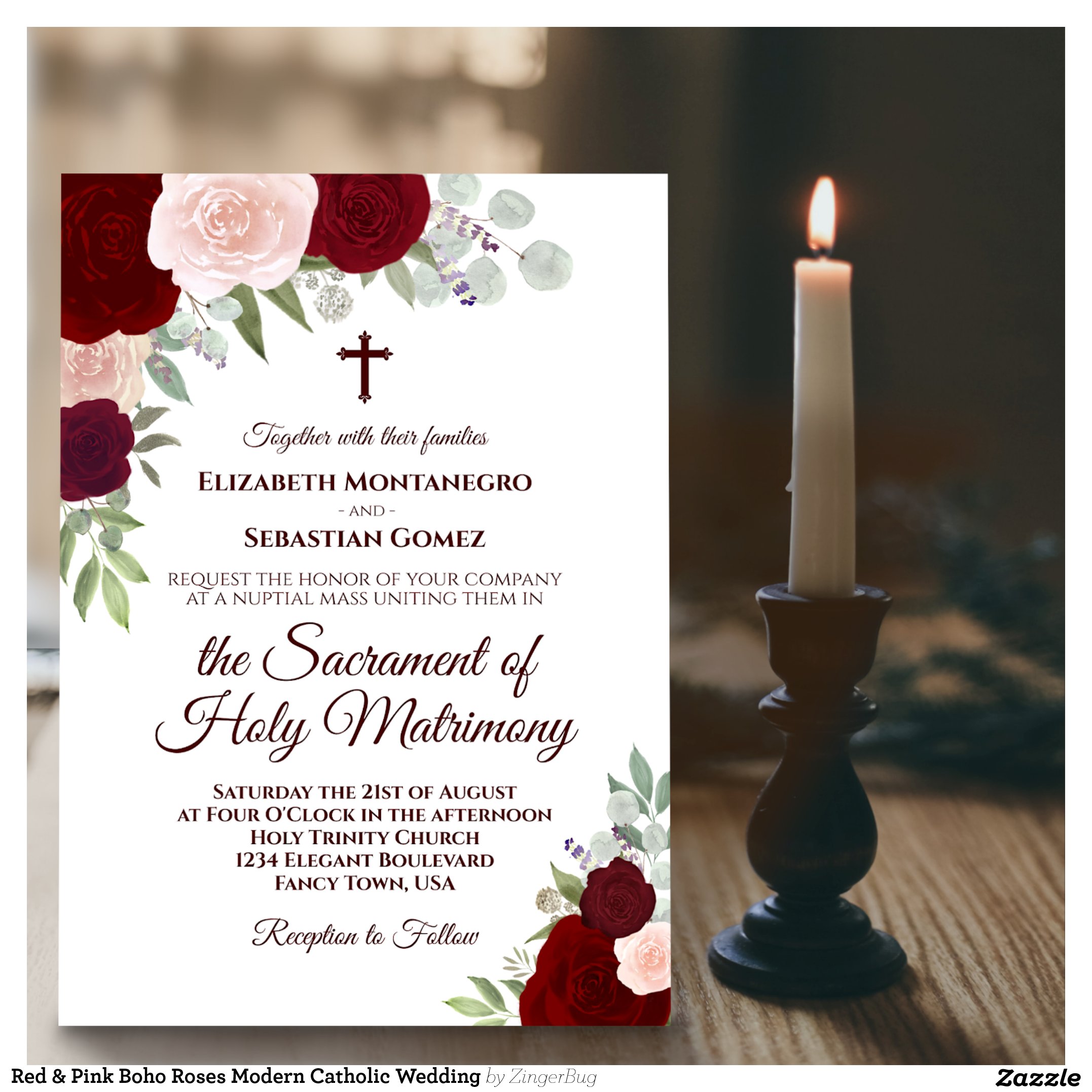 Red & Pink Boho Roses Modern Catholic Wedding Invitation