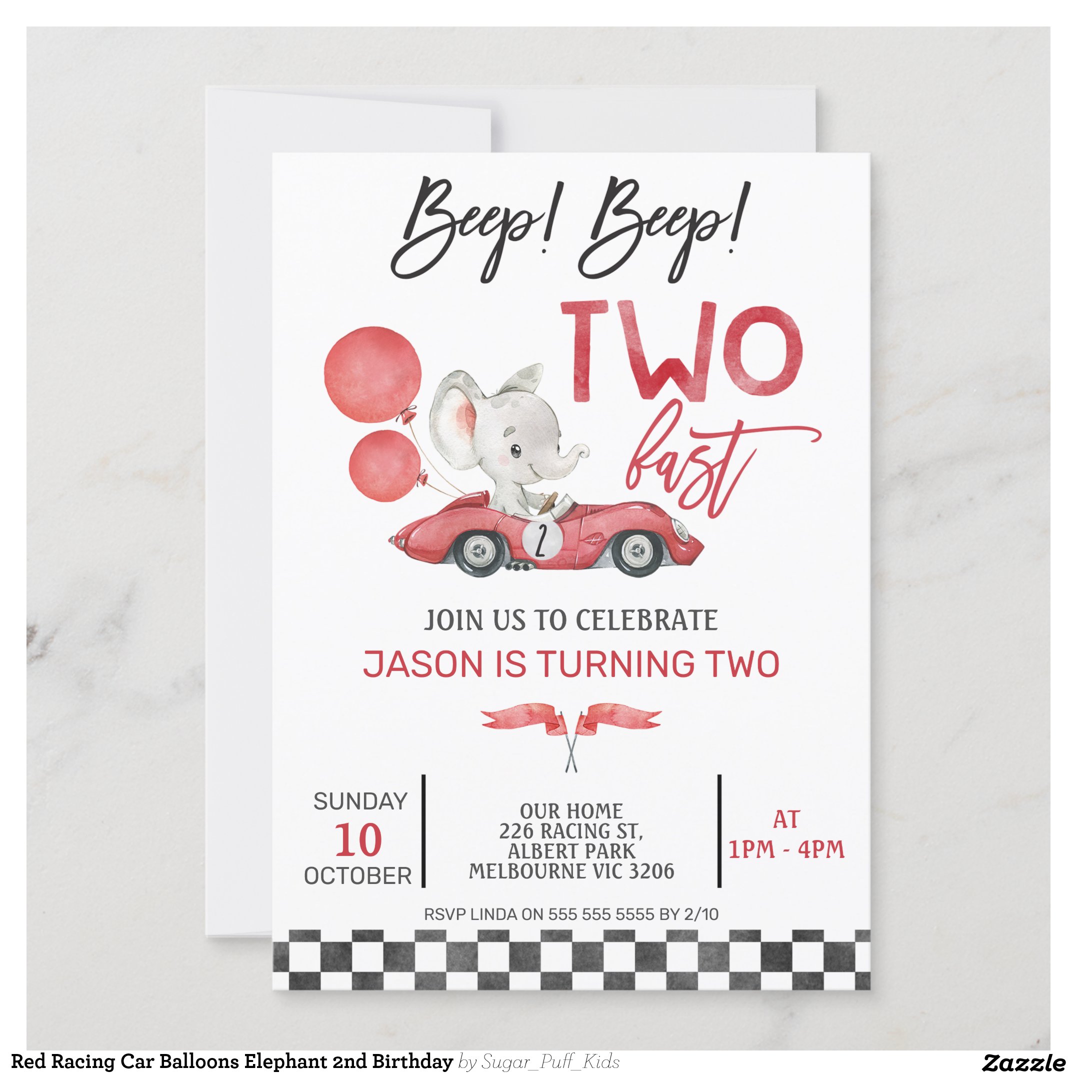 Be the first to review “Red Racing Car Balloons Elephant 2nd Birthday Invitation”