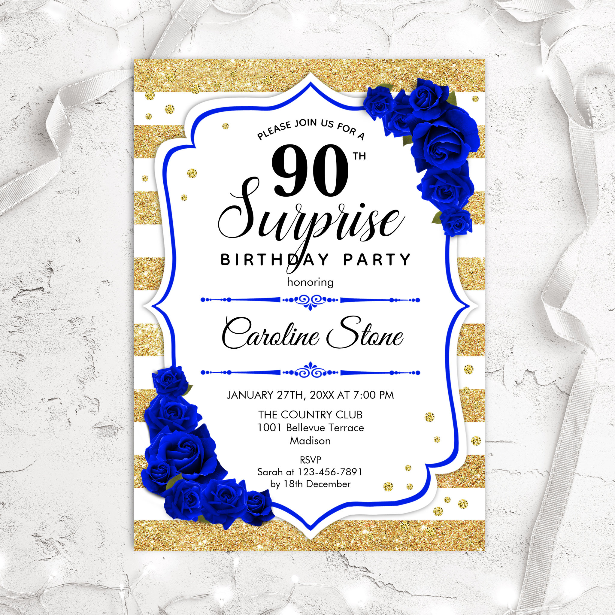 Surprise 90th Birthday – Gold White Royal Blue Invitation